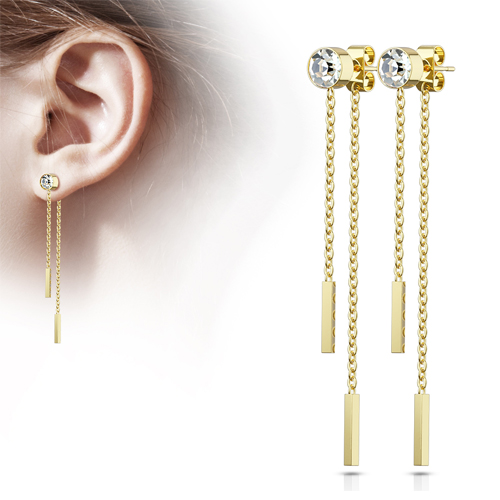 Oorbellen stud met vrij hangende dubbele ketting balkje